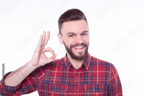 Strong, confident, handsome and bearded man in casual checkered shirt is posing isolated on white background with copy space for text and advertising