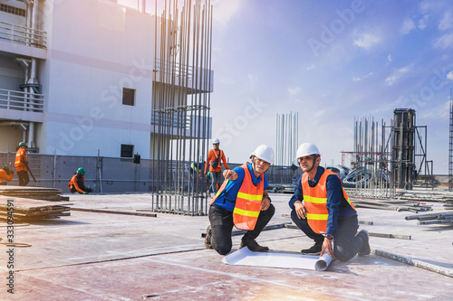 Structural engineer and architect working with blueprints discuss at the outdoors building construction site.