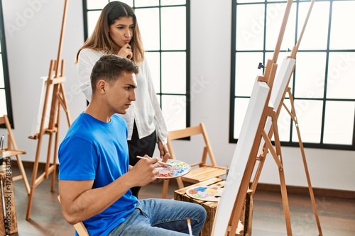 Student and teacher with serious expression painting at art school.