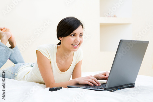 people, person, female, woman, girl, teenage, teenage, alone, home, indoor, bed, lying, white, room, caucasian, brunette, young, adult, pretty, laptop, typing, working, occupation, employment, technology, information, wireless, cordless, hand, pressing, pushing, typeset, attractive, casual attire, keyboard, computer keyboard, key, buttons, arm, wall, smile, positive, student, touching, network, happy, expression