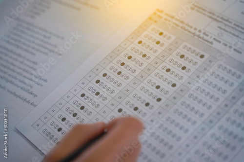 Student check Answer choice with pencil on optical form of standardized test answers bubbled score and a black paint examination box,Answer sheet School,education in university concept