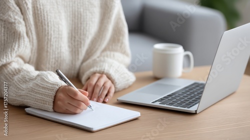 student lifestyle content creat Cozy workspace featuring a person writing in a notebook with a laptop and a mug nearby.