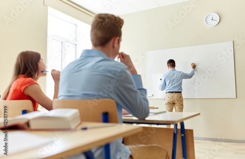 student, teacher, education, high, school, teaching, learning, man, group, boy, girl, people, person, young, teenage, teenage, teenage, appointment, presentation, indoor, class, classroom, college, cognition, study, studying, lecture, white, board, tutor, tutoring, writing, blank, copy space, copy, space, middle, age, something, lesson, learn, many, schoolboy, schoolgirl, pupil, back, rear, view, concept