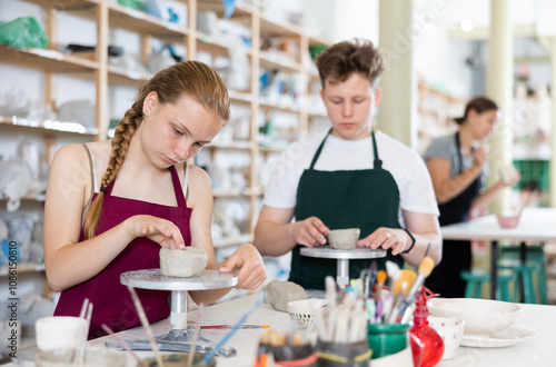 Students teenage girl and teenage boy sculpt ceramic product from raw clay in workshop
