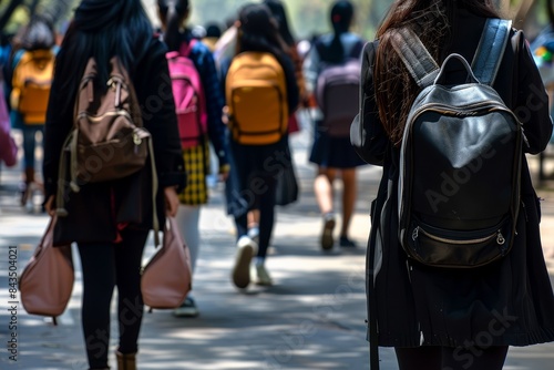 Students walking in campus environment - A group of students with backpacks walking away from the camera in what looks like a school environment, showcasing diversity and youth culture
