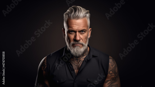 Studio lighting portrait photo of handsome stylish clothing good looking senior man with beautiful beard and tattoo. Elder healthy man fashion self care concept. Generative AI people model
