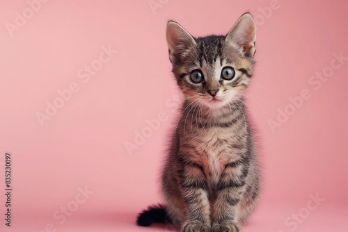 Studio photo of a cute tabby cat isolated against a background of pastel shades, creating a soft and appealing visual.