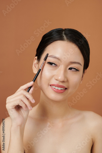 Studio portrait of smiling Vietnamese young woman brushing her eyebrows