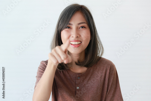 Studio portrait shot of Asian happy young beautiful pretty confident female teenager teen model in casual wears smiling laughing show teeth look at camera pointing index finger on white background