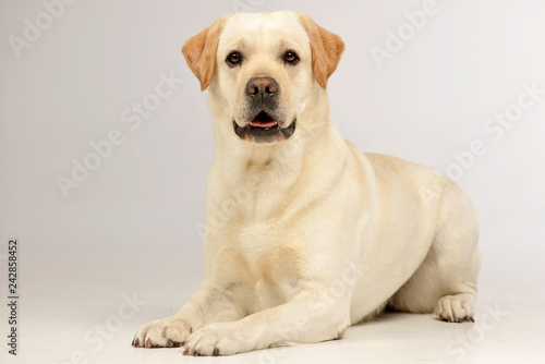 adorable, alone, animal, attention, beauty, bred, canino, curious, cute, dog, domestic, ear, eye, friendly, hound, indoor, isolated on white, labrador retriever, language, leg, listening, lovely, lying, mammal, mouth, many-coloured, nobody, nose, one animal, pedigreed, pet, purebred, retriever, smart, studio, studio shot, sweet, tongue, trust, vertebrate, white background, white coat