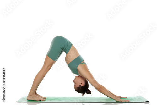 Studio shot of young woman in green outfit doing downward facing dog yoga pose (adho mukha svanasana) on white background.