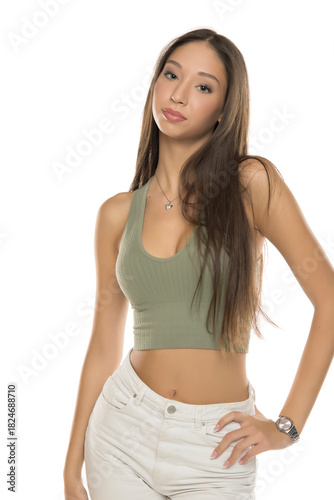 woman, posing, make-up, make up, confident, brunette, model, fashion, beauty, long hair, front view, fashion model, studio, white, copy space, female, natural, expression, crop top, pant, outfit, stylish, trendy, portrait, torso, casual attire, elegance, posture, lifestyle, skin, lipstick, eyeliner, mascara, clothing, pose, slim, confidence, teenage, girl, glamour, standing