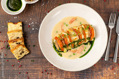 Stuffed chicken breast with tomato, mozzarella, cream and herb sauce