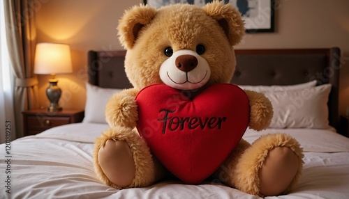 Stuffed teddy bear holding a "Forever" heart on a cozy bed for Valentine's Day