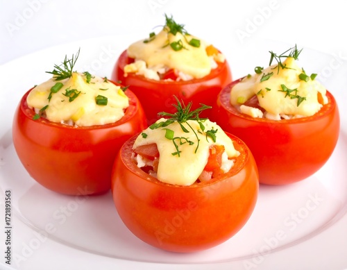 tomatoes, stuffed, food, dish, plate, white, red, yellow, cheese, creamy, delicious, healthy, fresh, ingredient, cooked, prepared, appetising, meal, tasty, vegetable, dinner, cookery, closeup, served