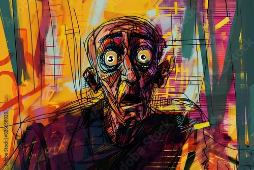 portrait, man, face, expression, emotion, shock, surprise, bewilderment, graphic, art, digital, painting, vignetting, brushstroke, colours, palette, vibrant, futuristic, city landscape, architecture, surreal, abstract, expressionist, moody, dramatic, distress, alarm, stunned, startled, anxious, tense, overwhelmed, chaotic, atmospheric, experimental, stylised, dynamic, energetic, bold, conceptual, symbolic