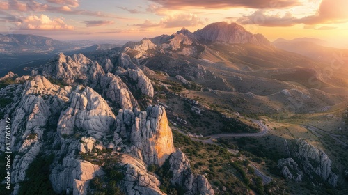 Stunning aerial view captures rocky mountains with towering stones road winding through the mountains under a beautiful sunset