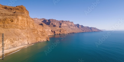 Stunning aerial view of rugged cliffs meeting a serene ocean under a clear sky, capturing the beauty of nature's formations.