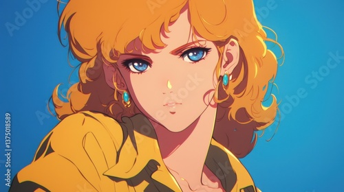 anime, girl, portrait, woman, blond, hair, blue, eye, yellow, jacket, fashion, art, illustration, digital, painting, drawing, style, beautiful, pretty, cute, elegant, posh, stylish, modern, contemporary, graphic, design, aesthetic, retro, vintage, 1980, 80s, 90s, manga, character, female, expression, confident, pose, artwork, image