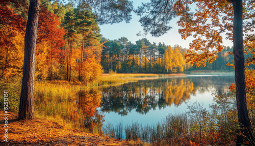Stunning autumn landscape showcasing vibrant foliage and tranquil lake reflecting colorful trees under a clear blue sky