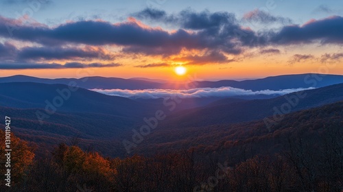 Stunning autumn sunrise over blue ridge mountains with vibrant colors and rolling fog