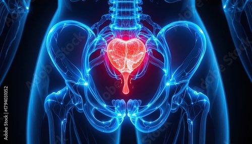 anatomy, medicals, health care, bladder, bone, skeleton, human, body, organ, science, biology, health, illustration, x-ray, scan, system, internal, diagram, structure, education, teaching, learning, research, scientific, visualisation, detail, illuminated, glowing, blue, vibrant, modern, futuristic, technology, digital, abstract, design, art, graphic, three-dimensional, render, hospital, clinic