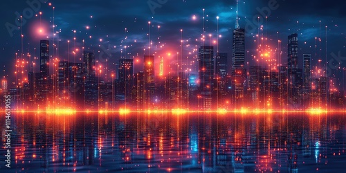 Stunning city skyline illuminated by vibrant lights at night reflecting on calm waters
