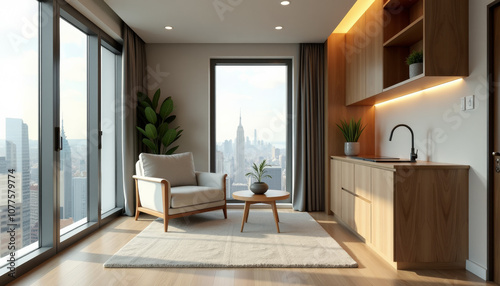 apartment, modern, city view, living room, kitchen, wood, design, interior, decor, furniture, minimalist, cosy, elegant, stylish, comfortable, natural light, window, tall, view, urban, home, space, simple, contemporary, architecture, beautiful