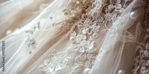 Stunning close up of a beautiful wedding dress, showcasing intricate details and elegant design. This beautiful wedding dress captures the essence of romance and sophistication in fashion.