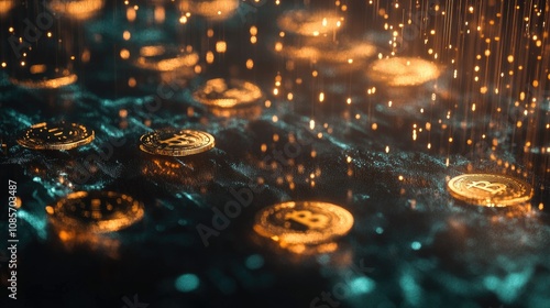 coin, digital, finance, technology, investment, wealth, gold, shimmering, particle, abstract, dark, reflective, network, virtual, money, holographic, illuminated, futuristic, glow, macro, environment, economy, asset, modern, design, composition, innovative, dynamic, financial, graphic, metallic, trading, background, unique, artistic, rich, crypto, secure, innovation, closeup, hd, high-coloured, detailed, vibrant, glowing, textured, blurred