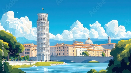 pisa, tower, leaning, italy, architecture, landmark, travel, tour tourism, historic, building, sky, blue, cloud, greenery, river, bridge, city landscape, illustration, scenic, famous, heritage, europa, vacation, destination, iconic, structure, art, drawing, culture, sightseeing, historical building, summer, outdoors, landscape, picturesque, attraction, urban, skyline, italian, watercolor, painting
