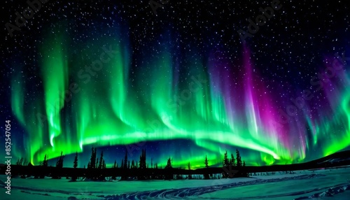 Stunning display of northern lights in vibrant green and purple hues over a snowy landscape. The starry night sky and silhouetted trees create a mesmerizing and serene scene.. AI Generation