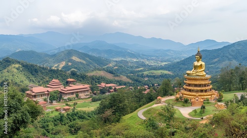Stunning Golden Buddha Statue Surrounded by Scenic Mountain Landscape