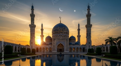 Stunning Islamic mosque with blue domes and minarets reflects at sunset, evoking peace and spirituality.