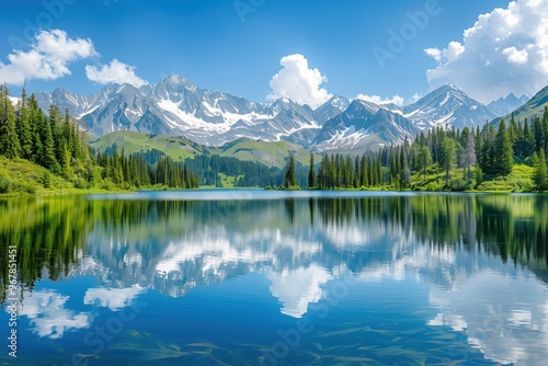 Stunning mountain landscape with snow-capped peaks reflecting in a clear lake, surrounded by lush pine trees and blue sky.
