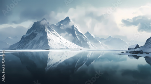 mountain, peak, fir-wood, panorama, watercolor, ink, early morning, majestic, slope, aerial photography, background, hill, snow, sky, cloud, lake, mist, forest, sunset, alps, painting, illustration, simple, winter, aerial view, three-dimensional, foreground