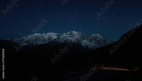 Stunning nocturnal scene featuring snowy peaks and a dimly lit pathway