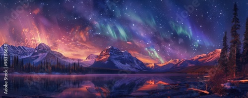 Stunning Northern Lights illuminate night sky over mountains, reflecting on a serene lake.