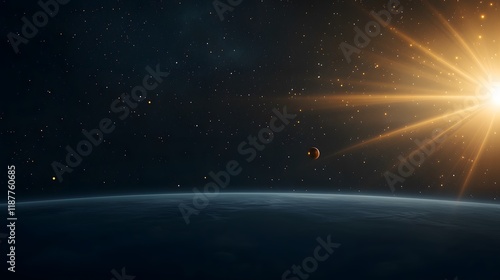 Stunning Partial Solar Eclipse Over a Planet with Glowing Sun and Stars in the Vast Universe
