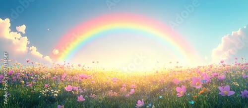 Stunning rainbow arching over a vibrant blooming flower meadow bathed in warm golden sunlight Serene idyllic pastoral landscape with clear blue sky and fluffy white clouds Beautiful