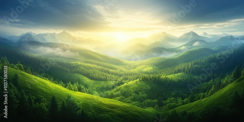 Stunning summer day in wild mountains featuring coniferous forests and lush green slopes Radiant sunshine creates a vibrant atmosphere Perfect for nature photography and home decor