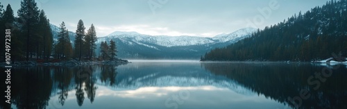 Stunning sunrise over Lake Tahoe reflecting colorful hues on calm waters with snow-capped mountains in the background