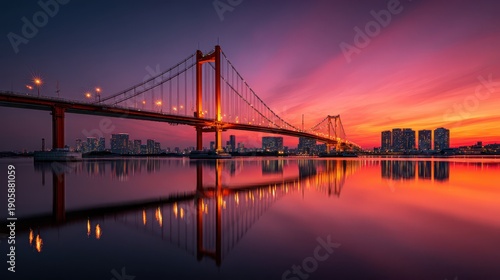 Stunning sunset over a suspension bridge reflecting on calm water with a city skyline at twilight