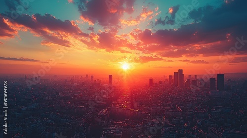 Stunning Sunset Over Urban Landscape with Vibrant Clouds and Warm Colors in City Skyline