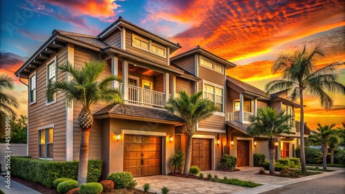 stunning tropical florida townhouse exterior at sunset with vibrant orange hues and rustic wooden accents