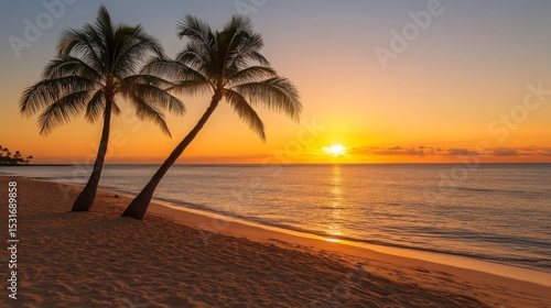 Stunning Tropical Sunset Scene Two Palm Trees on Sandy Beach Golden Hour Ocean View