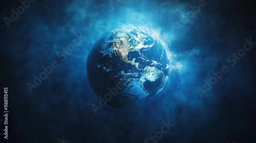 stunning view of Earth from space, showcasing continents and oceans illuminated by blue glow. This evokes sense of wonder and connection to our planet