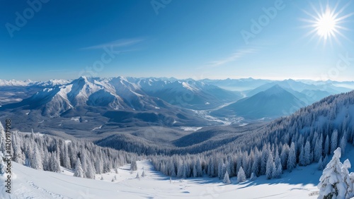 winter, mountain, snow, forest, landscape, panorama, fisheye, sunny, day, blue skies, snow-covered, winter landscape, mountain chain, scenic view, snow-capped, winter scenery, mountain scenery, serene, peaceful, nature, photo, hi-res, winter landscape, cold, frigid, tree, pine tree, pine forest, horizon, huge, extending, peak, vale, white, blue, sun, bright, cold weather