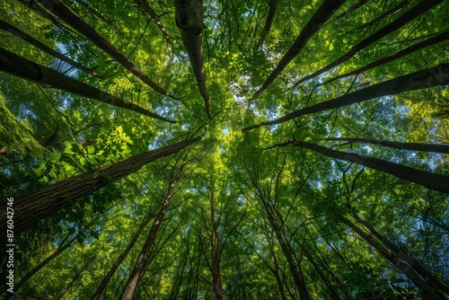 Stunning wide-angle view of the canopy from below, showcasing tall trees with lush green leaves in an expansive forest under a blue sky