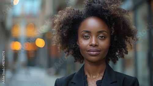 Stylish Afro-American Businesswoman Outdoors with Blurry Business Center Background